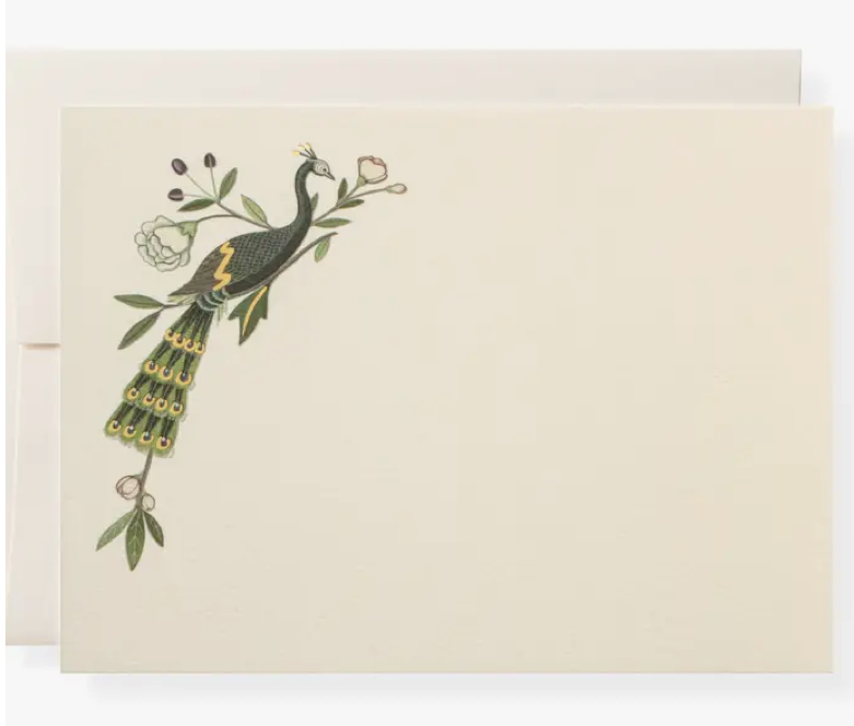 Our Peacock flat notes are printed and foiled in Memphis, TN. Full color ink printed on natural white paper, letterpress printed in gold foil, and paired with natural white envelopes. Sold as a Box of 10 flat notes with blank envelopes or Bulk of 100 flat notes with blank envelopes. Paper color | natural white. Envelope color | natural white. Dimensions | 4.25 x 5.5 inches. Quantity | box of 10