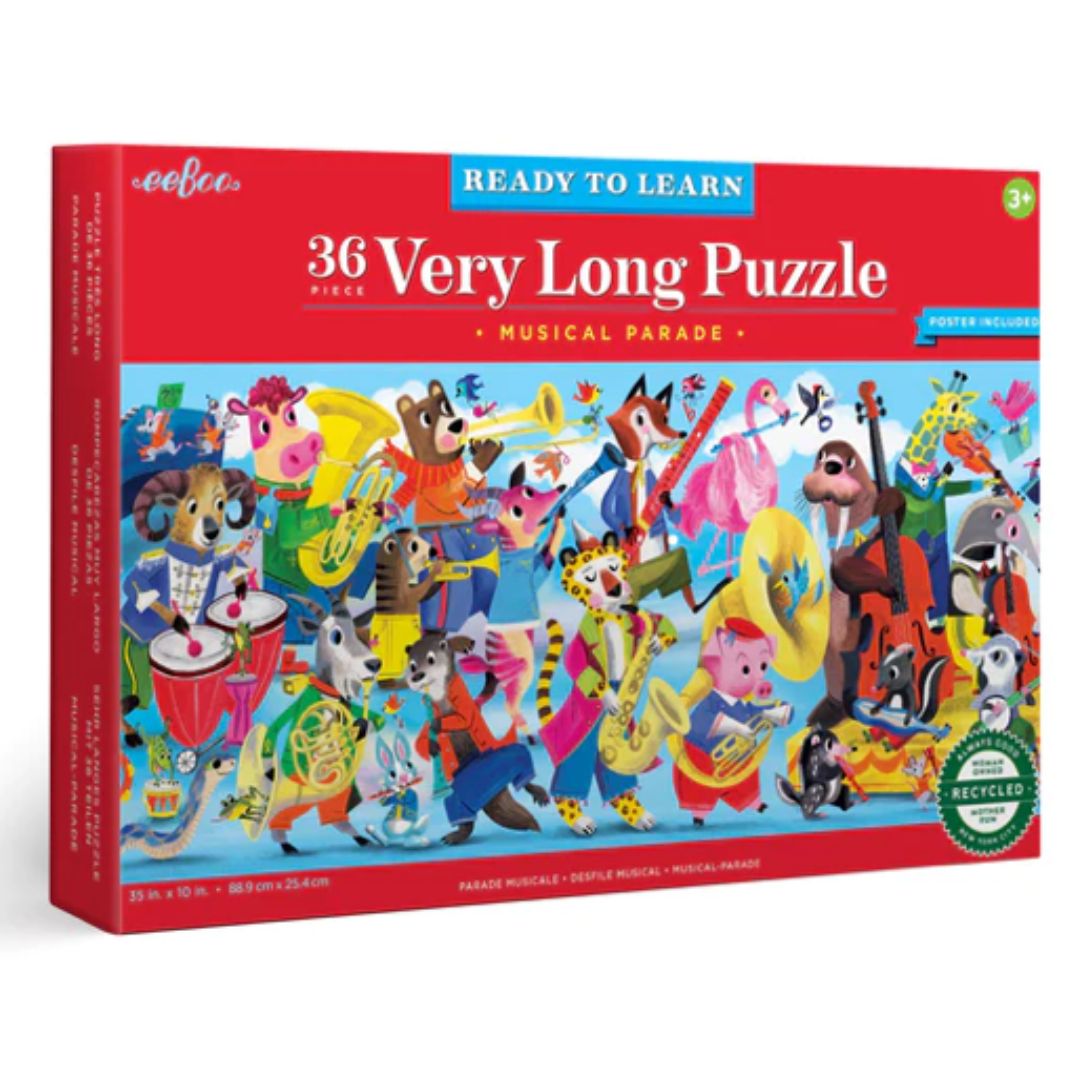 A colorful array of animals in an extra-long puzzle introduce over thirty musical instruments.