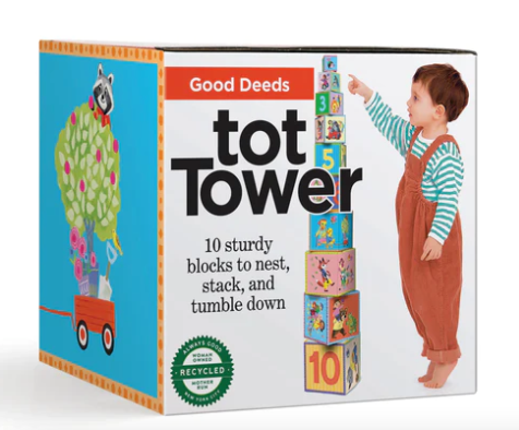 FWith eeBoo's First Words Tot Towers children learn simple first words while building  and knocking down these sturdy and colorful nesting blocks. Largest block is approximately 6 inches.  Set of 10 blocks whimsically illustrated by Monika Forsberg.