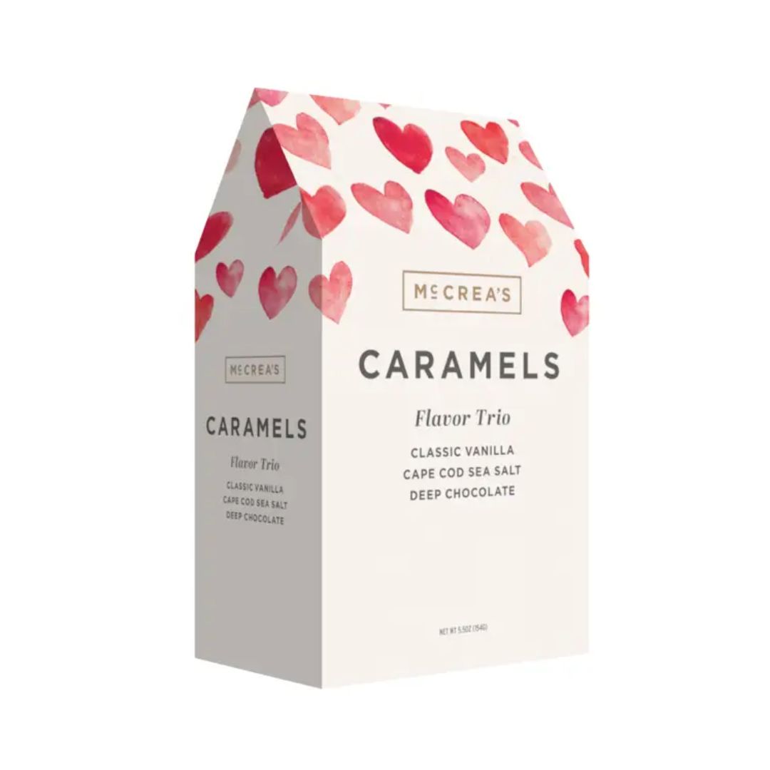 The Hugs & Kisses Gable Box is part of McCrea's NEW Greetings Collection and is perfect for special occasions such as Thinking of You, Get Well Soon, I Love You, and more. Each box contains 5 pieces each of these favorite flavors: Classic Vanilla, Cape Cod Sea Salt, and Deep Chocolate. 15 individually-wrapped pieces of caramel in all