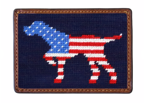 Our hand-stitched needlepoint card wallets are finished with English bull hides tanned in Italy. This slimmer wallet style (4” by 3”) provides enough room for cards, cash, and an ID, but does not take up too much room in the pocket or bag. Great for carrying in your front pocket and something less bulky for a night on the town!